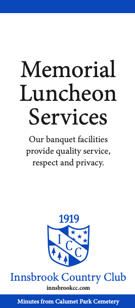 Conveniently located down the street from Calumet Park Cemetery, Innsbrook Country Club has elegant banquet and private party rooms. During times of loss, coming together to honor a loved one's memory is essential. Our Memorial Luncheons offers a private, comforting space for family and friends to gather, share stories, and find solace in each other's company.
